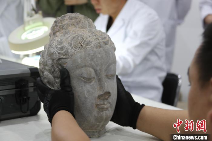 5月20日,河南洛阳,龙门石窟研究院工作人员展示已完成修复的唐代佛头。中新社记者 阚力 摄