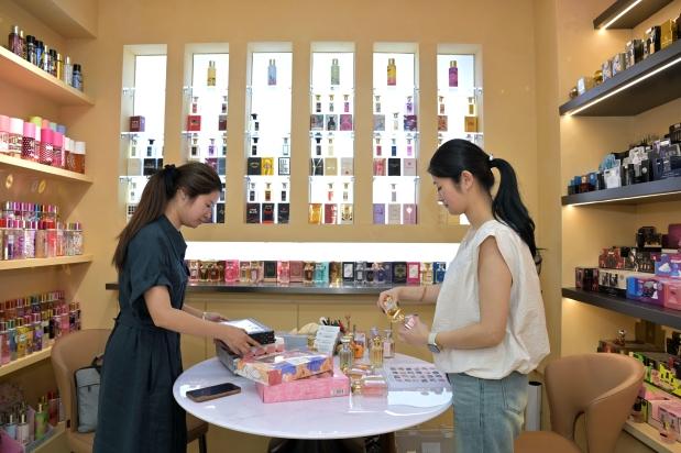 5月23日,义乌市国际商贸城三区的浙江丽芙秀化妆品有限公司商位,客户正在选购一批发往南美的香水,最近南美、中东、非洲等市场的订单都在加紧出货。 (吕斌 摄)
