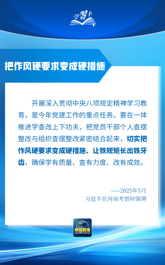 开展深入贯彻中央八项规定精神学习教育,是今年党建工作的重点任务。习近平总书记近日在河南考察时强调,切实把作风硬要求变成硬措施、让铁规矩长出铁牙齿。