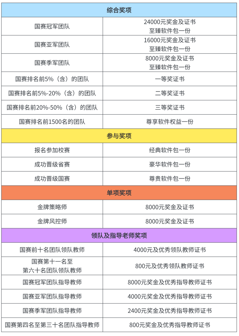 大赛设置有多重奖励以鼓励在比赛中表现优秀的选手和老师。国赛冠亚季团队可以分别斩获24000元、16000元和8000元奖金奖励及证书。单项表现突出的金牌策略师和金牌风控师可获得8000元奖金及证书。大赛还特别设置有领队及指导老师奖项,国赛团队的领队老师和指导老师可获得奖金和软件包奖励。所有报名参赛的同学和每位领队老师、指导老师均可获得经典软件包一份。