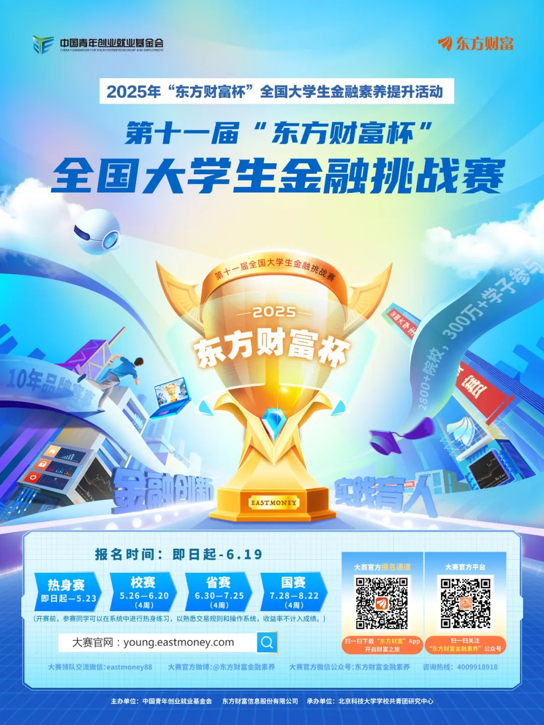 为组织动员广大高校青年学生学习金融知识、提升金融素养、提振发展信心、提高社会化能力,积极投身金融强国建设,中国青年创业就业基金会、东方财富信息股份有限公司联合举办第十一届“东方财富杯”全国大学生金融挑战赛,作为“东方财富杯”全国大学生金融素养提升活动的重要内容。