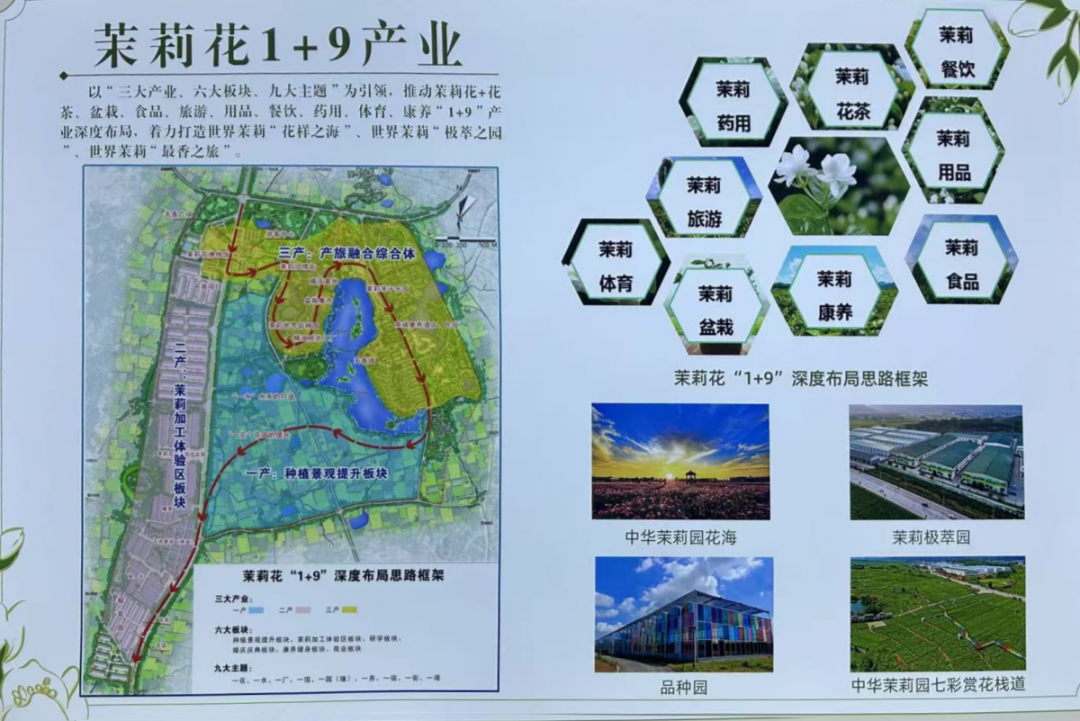 为推动茉莉花产业转型升级,横州市深度布局“1+9”产业,推动茉莉花由单一花茶产业,构建“茉莉花+”花茶、盆栽、食品、旅游、用品、餐饮、药用、体育、康养“1+9”产业集群,不仅丰富了产品业态,还形成全产业链融合发展体系。