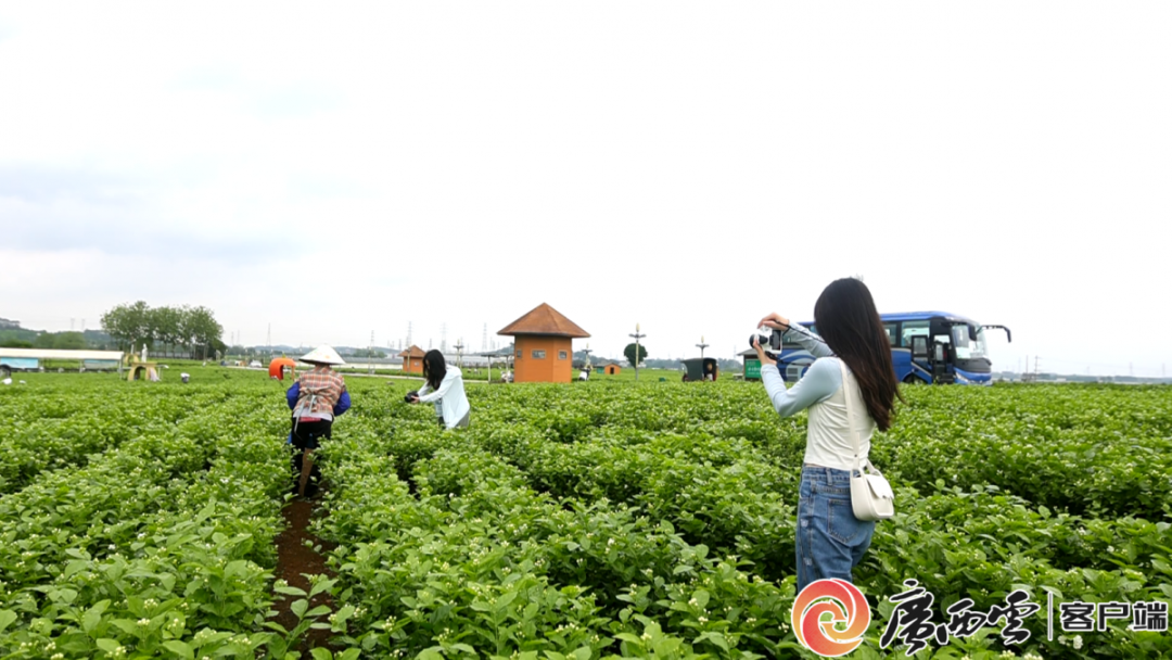 5月20日上午,在横州市校椅镇石井村中华茉莉园,连片的茉莉花田生机盎然,花朵洁白如雪,清香四溢。花农身挎竹篓,穿梭在花丛间,熟练地采摘着一朵朵饱满的茉莉花。