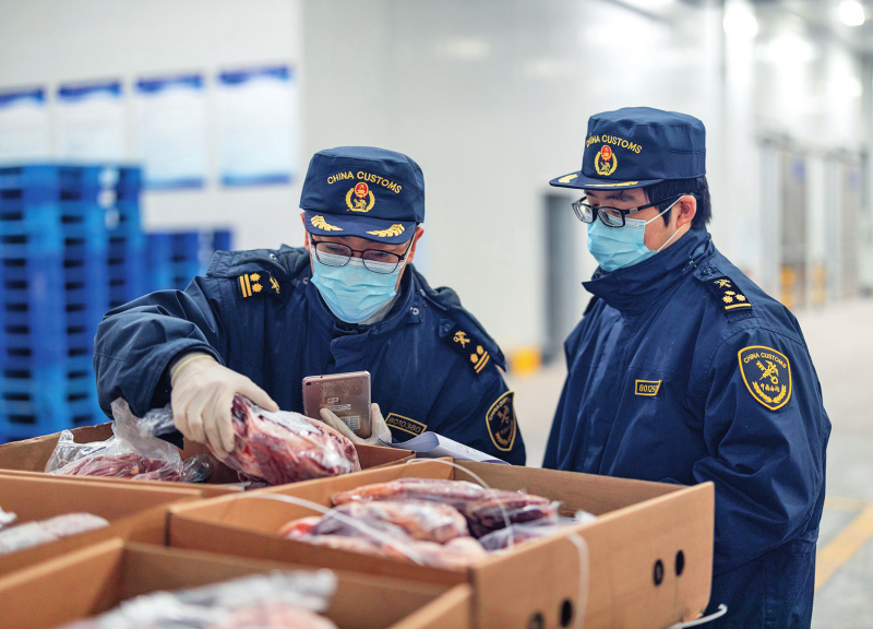 在重庆国际物流枢纽园区,重庆海关所属渝州海关的工作人员正仔细查验通过 西部陆海新通道进口的牛肉(2025 年 1 月 17 日摄) 黄伟摄 / 本刊