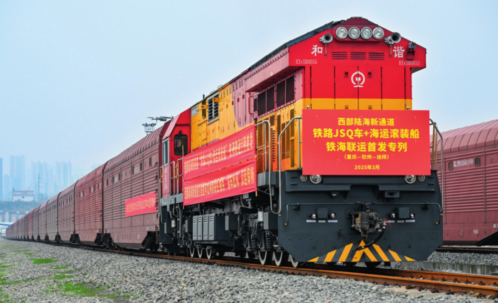 一列满载 200 台长安汽车的铁路 JSQ 凹底双层运输汽车专用车专列从重庆鱼嘴 站缓缓驶出,将经西部陆海新通道直达广 西钦州港后,再通过滚装船发往阿联酋迪 拜杰贝阿里港(2025 年 3 月 21 日摄) 新华社发