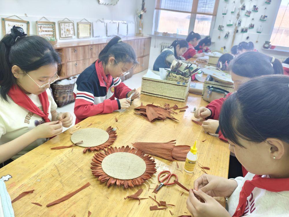 统部小学有一片十余亩的劳动试验田,种满了玉米。每到秋收时节,任慧敏就带着同学们到田里收集玉米皮,晒干加工成做手工的材料。任慧敏说:“学校开设了玉米皮粘贴画社团课程,用农村随处可见的玉米皮制作粘贴画,很受学生们欢迎。”