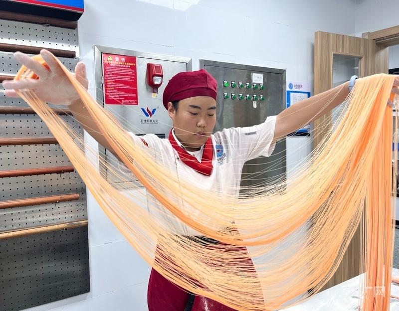 在热菜实训区,学生刘豪卓展示甩饼绝技:“关键在火候把控与动作连贯,需经数百次以上实操才能成型。”另一个实训室内,程嘉楠两手捧起面条不断操作,将面团快速拉扯出细如发丝的面条。