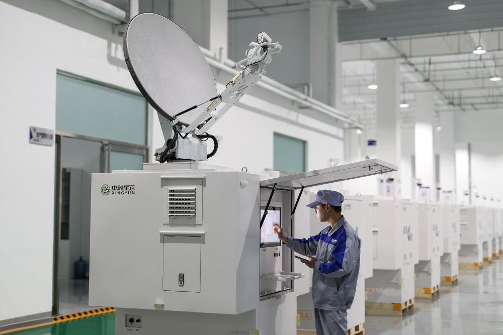 4月21日,工作人员在中科星云智造基地调试一款装有卫星天线的数据方舱产品。新华社记者 杜潇逸 摄