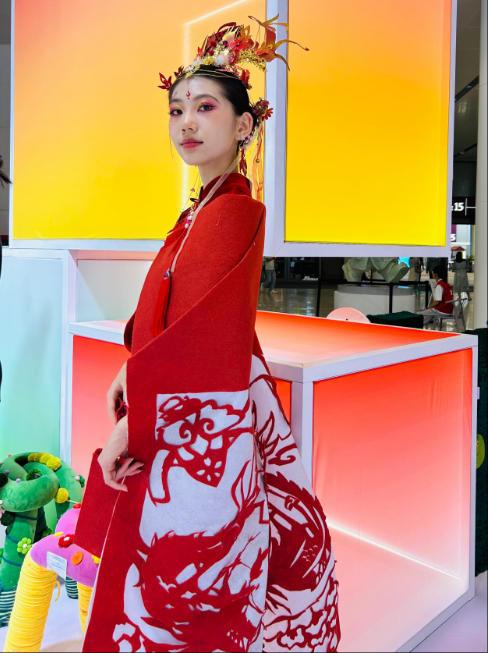 展区内,深圳市新安中学(集团)第一实验学校师生带来的非遗剪纸时装作品《有凤来仪》,兼具东方美学神韵与现代设计理念,为古老非遗注入青春力量,吸引观众驻足拍照。