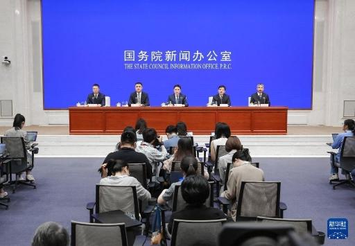 5月27日,国务院新闻办公室在北京举行国务院政策例行吹风会,商务部副部长兼国际贸易谈判副代表凌激、生态环境部科技与财务司司长王志斌、商务部外国投资管理司司长朱冰、市场监管总局法规司司长彭新民介绍深化国家级经济技术开发区改革创新有关举措,并答记者问。新华社发(刘健 摄)