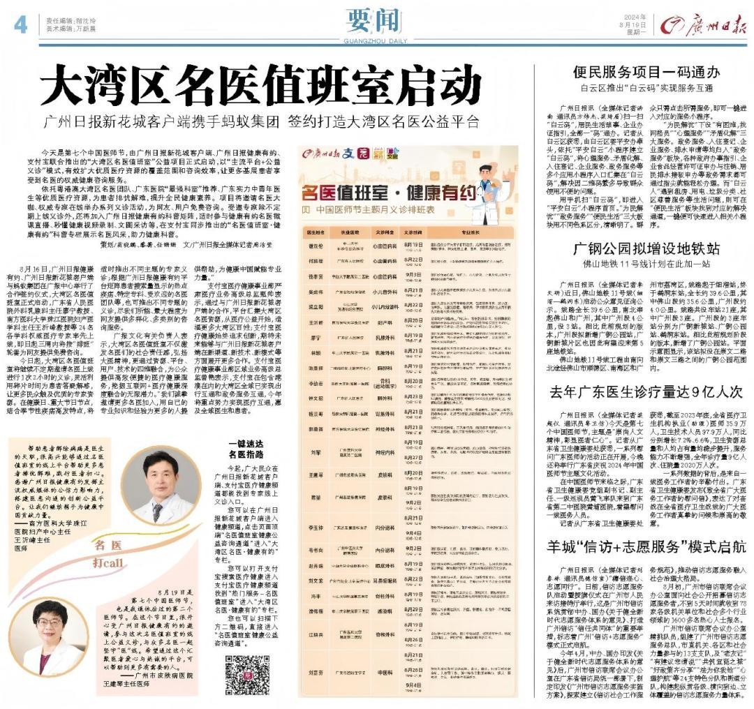 2024年8月19日《广州日报》大湾区名医值班室启动版面图。