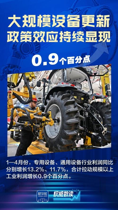 国家统计局、工信部等部门最新发布的数据显示,今年前4个月,我国工业企业利润增长加快、工业投资保持增长、装备制造业引领作用突出、“两新”政策效应持续显现……一系列数据,充分展现出我国工业经济的强大韧性和抗冲击能力。