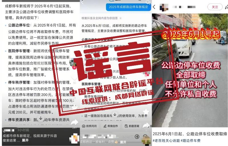 真相:近日,个别网民在网络平台发布信息称,“成都市停车新规定,从2025年6月1日起,所有公路边停车位将不再收取停车费,市民可以免费使用”,引发关注。对此,微信公众号“成都停车App”发布声明称,网传“成都市所有公路边车位将不再收取停车费用”“6月1日起成都路边停车位0元”系不实信息,暂未收到上级单位停止收费的通知。成都市中心城区临时占道停车场是按照《四川省〈中华人民共和国道路交通安全法〉实施办法》的相关规定,由成都市公安交管部门统一规划、设置。收费标准按照成都市发改委《关于调整城区机动车临时占道停放差别化收费标准的通知》(成发改收费〔2011〕1334号)文件执行。(来源:“成都网络辟谣”微信公众号)