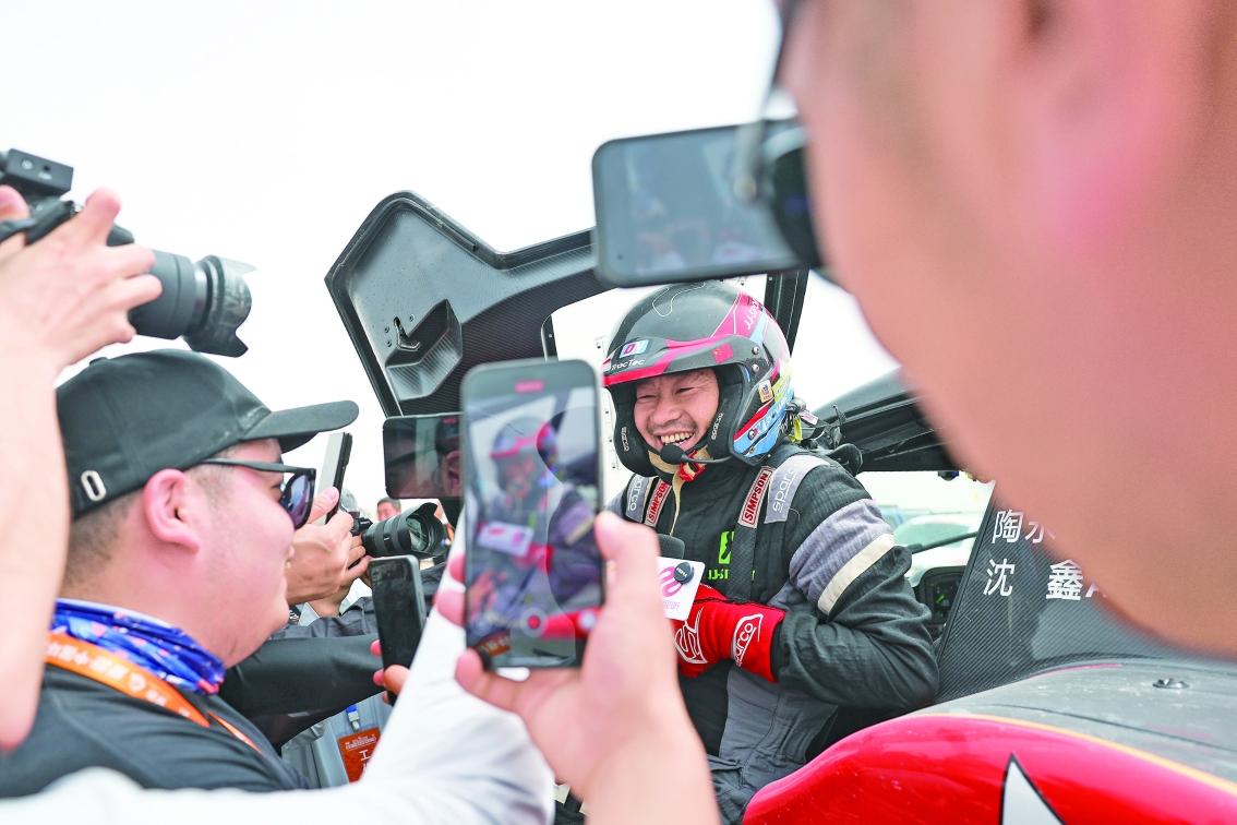 5月23日,车手陶永明率先抵达赛段终点后接受采访。当日,2025中国环塔国际拉力赛第三赛段比赛在柯坪县进行。该赛段长330多公里,以狭窄涉水峡谷、戈壁等地形地貌为主。新华社记者 胡星宇 摄