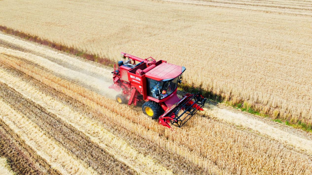 图为5月27日,农机手驾驶大型机械在山东临沂市郯城县泉源镇大马庄村的麦田里收割成熟的麦子。(李学飞 摄)