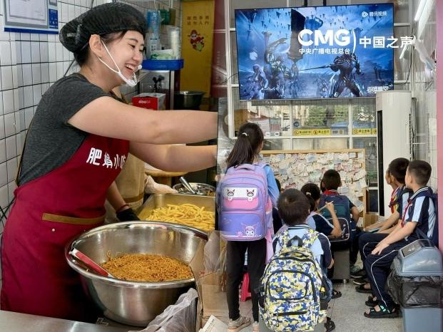 中午时分,遂城三小的孩子蜂拥而至,端好了火鸡面、薯条、淀粉肠,下一步是在电视机前占个好位置。满屋尽是熟练工,邱智娟的丈夫林景欢已经提前续上了前一天的动画片。