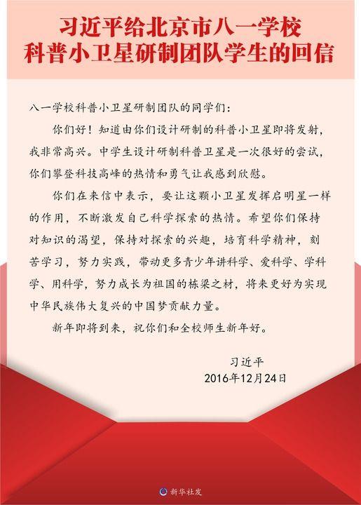 三个多月后,同学们给习近平总书记写信,报告小卫星即将发射的消息,很快收到了总书记的回信。习近平总书记在回信中说,“你们攀登科技高峰的热情和勇气让我感到欣慰”“希望你们保持对知识的渴望,保持对探索的兴趣,培育科学精神,刻苦学习,努力实践,带动更多青少年讲科学、爱科学、学科学、用科学,努力成长为祖国的栋梁之材”。