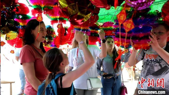 山脚下热闹的端午市集格外引人注目,琳琅满目的五彩绳、香包和手工饰品让俄罗斯游客流连忘返,大家纷纷试戴购买,感受着浓厚的节日氛围。