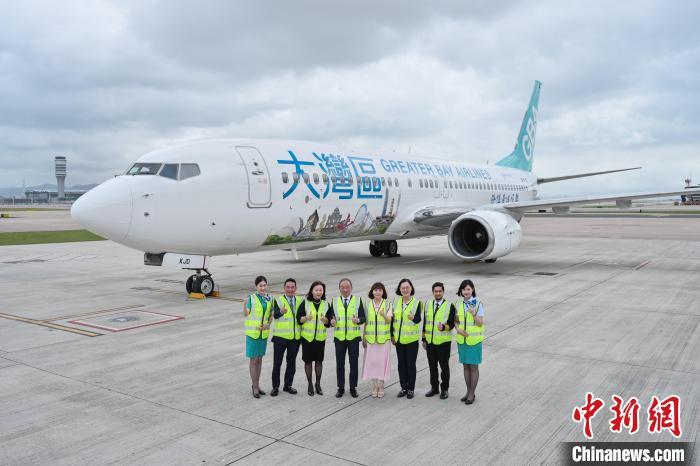 中新社香港6月2日电 “大湾区号”飞机揭幕仪式2日在香港国际机场举行。该机机身印有“发挥香港优势 建设一流湾区”图案,是大湾区航空机队其中一架客机。大湾区航空对记者表示,将安排“大湾区号”执飞来往香港与中国内地等亚洲多条航线,向世界说好粤港澳大湾区故事。
