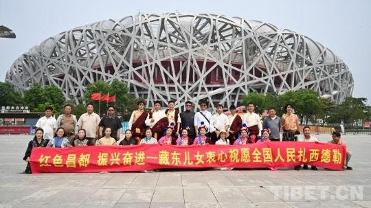 图为西藏自治区昌都市洛隆县文艺代表团在鸟巢前合影