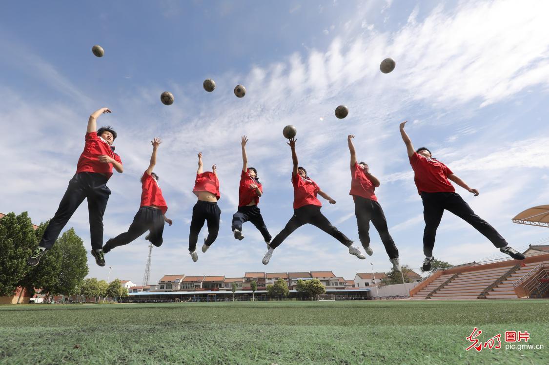2025年6月4日,河南省焦作市温县启明实验高中高三学生在操场上做抛球减压游戏。