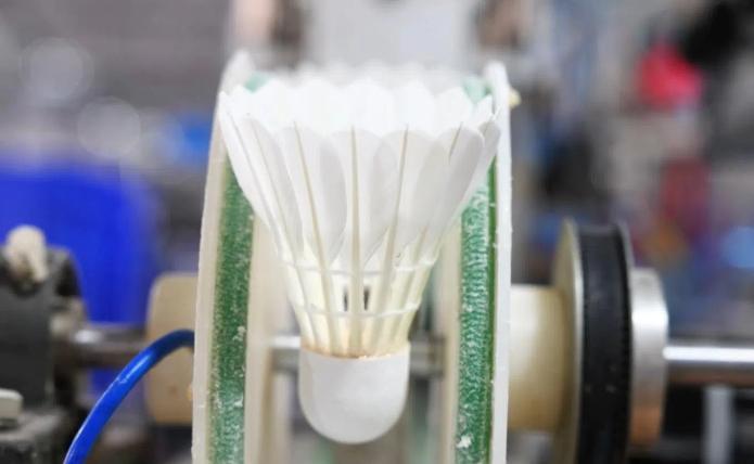 胡兵【贵州亚狮龙体育文化产业发展有限公司生产经理】:一只鹅或鸭的翅膀上只有14根羽毛可以用来做好的羽毛球——左边7根,右边7根。这个设备就是要把不同位置的14根羽毛给分出来。另外,鹅是做鹅的羽毛球,鸭是做鸭的羽毛球,不同鹅、不同鸭的品种还要分开。选完毛后,就到了冲毛环节,机器会把羽毛的中间一段裁剪出来,大概是0.11克重。接着,这些羽毛就会被插到球底,变成羽毛球。一个羽毛球有16根羽毛。也就是说,一只鹅或者一只鸭的翅膀上的14根羽毛还不够做一个羽毛球。