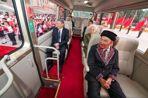 2024年9月29日,国家荣誉称号获得者乘坐礼宾车抵达人民大会堂。新华社记者刘彬摄
