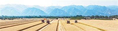 联合收割机在山西省运城市盐湖区解州镇曲村麦田里收割小麦。薛 俊摄(新华社发)