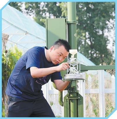 雷宇在位于成蹊家庭农场的气象观测站里清洁雨量筒。本报记者 高 炳摄