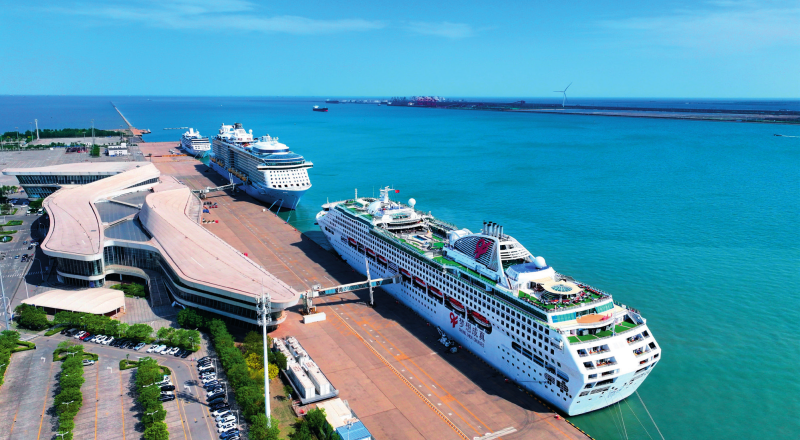 三艘国际邮轮停靠在天津国际邮 轮母港(2025年5月1日摄) 赵子硕 摄/本刊