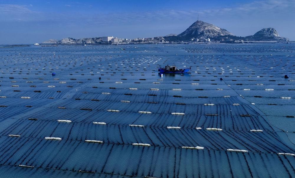 3月18日,福建省宁德市霞浦县三沙镇海域的海洋牧场,养殖工人在进行养殖作业。新华社发(王旺旺摄)