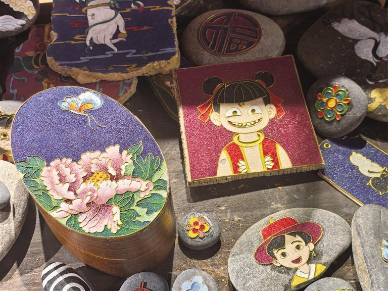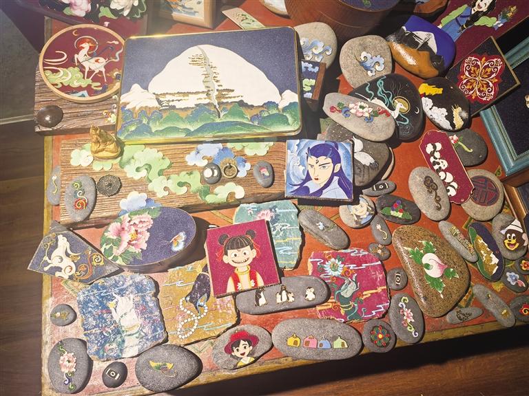 他拿起一枚掌心大小的石头,铜丝在其上掐出精细的花朵轮廓,釉彩点染着柔和的蓝与绿,小巧玲珑却意趣盎然。这些作品是可以置于案头、握在掌心、赠予友人的美好物件,承载着祝福、回忆或单纯的喜爱。