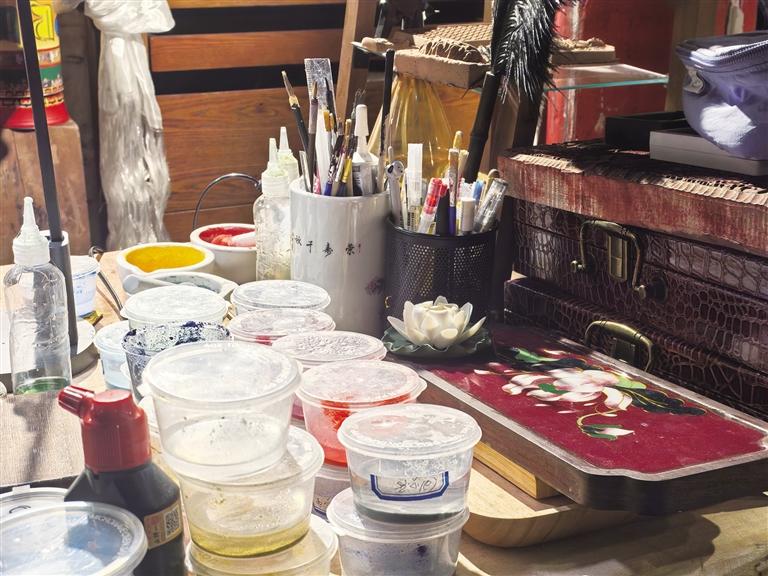 下一步是“点蓝”,为骨架注入血肉与灵魂,上色点蓝是整幅画完善境界的关键。釉料首先需经淘洗,填充要求极其严格。他取过细长的铜铲,轻挑一点孔雀石粉入水,小铲尖探入铜丝圈出的微小区域,轻轻一送,釉浆便有了生命,顺铜丝内壁滑下,填满不足半毫米深的“沟壑”。“色彩需分明,过渡要平和,层次得鲜明,串色、漏色、露底板都是大忌。”点蓝之后,还需经过晾晒、最后定型(制裱)等工序,一件作品才算完成。