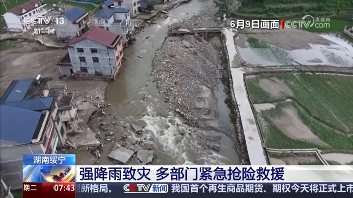 6月8日,湖南邵阳绥宁县遭遇强降雨,7个乡镇出现洪涝灾害,公路、电力等设施不同程度受损。9日清晨开始,相关部门陆续进入到本次受灾最重的绥宁县金屋塘镇抢险救援。