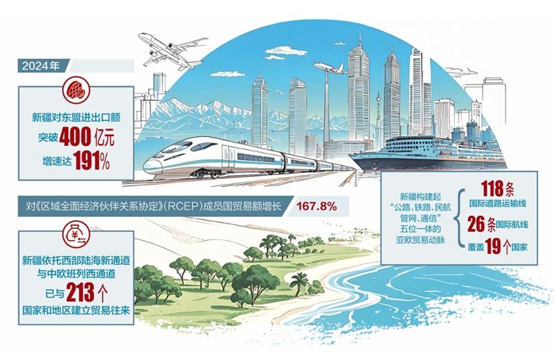 ——118条国际道路运输线、26条国际航线覆盖19个国家,新疆构建起“公路、铁路、民航、管网、通信”五位一体的亚欧贸易动脉。
