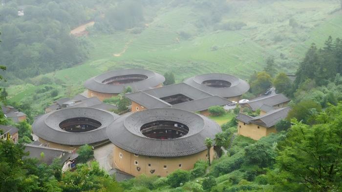 雨中的田螺坑土楼群。(新华社记者 周义 摄)