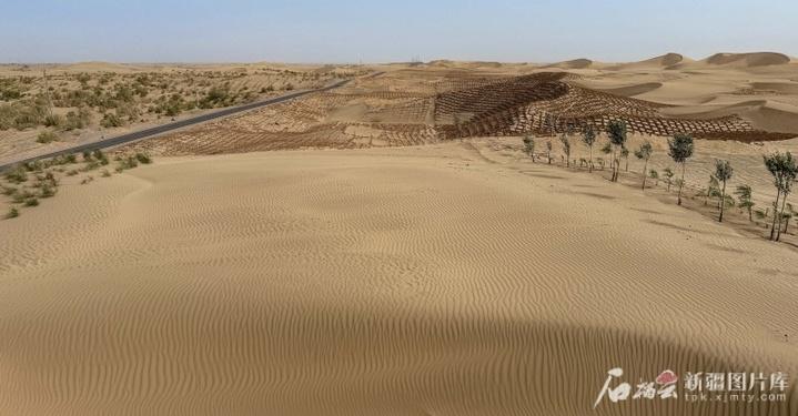 6月13日,在且末县防风治沙基地,一株株红柳、梭梭及草方格守护着沙海。