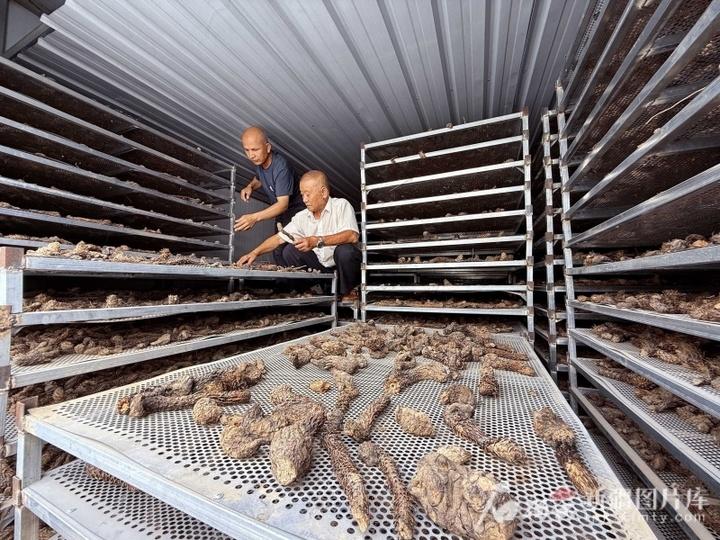 6月13日,在且末县老兵治沙队,工人正在查看晒干的肉苁蓉。