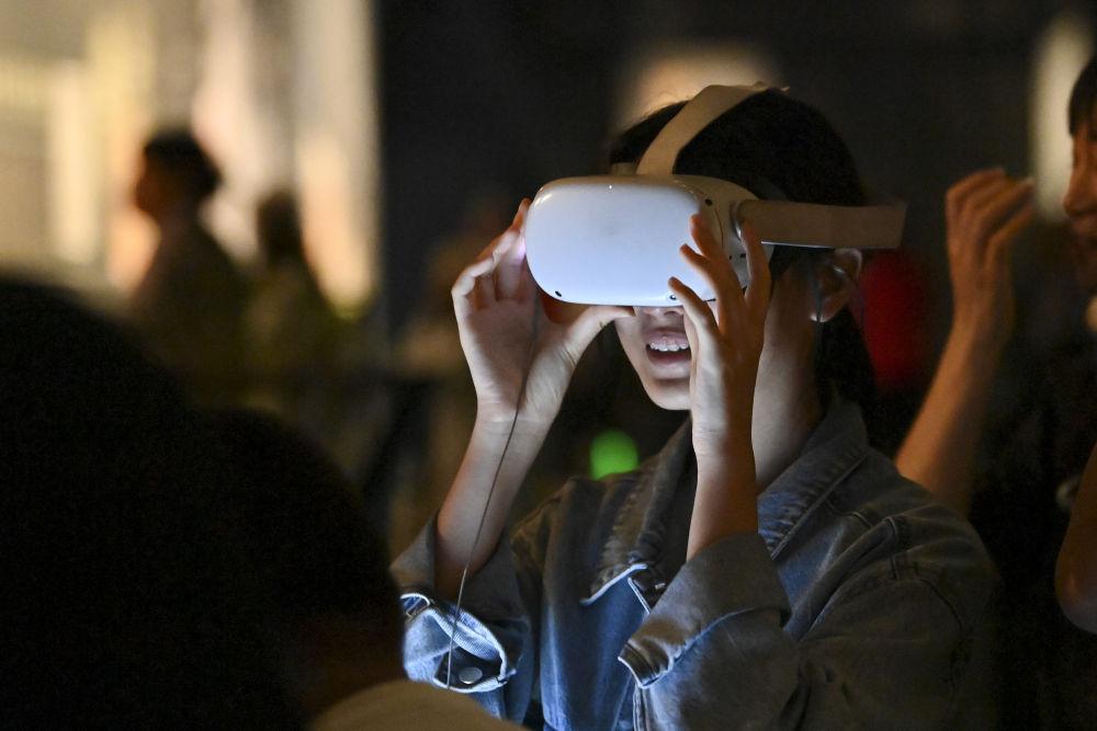 2024年7月22日,游客借助VR设备沉浸式游览莫高窟第285窟虚拟场景。新华社记者 郎兵兵 摄