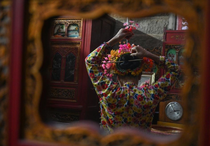 在福建泉州蟳埔村,早起的蟳埔女翁秀珍在给自己“簪花围”。(图片来源:新华社视频截图)