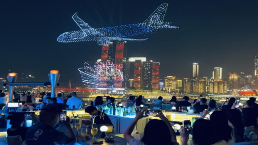 “无人机灯光秀,带火了重庆的‘天台经济’。”重庆之眼天台吧的创始人张正松是较早一批深耕“天台经济”的商家。张正松分享,重庆夜经济越来越火,每逢有无人机表演当天,晚上7点左右,门口便会排成一条长龙。