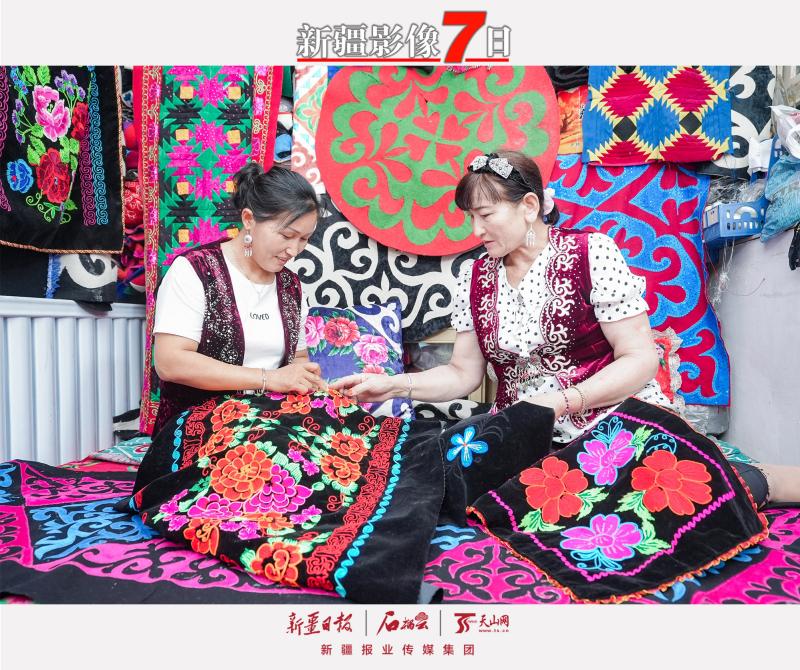6月12日,乌苏市古尔图镇金巧手哈萨克族刺绣企业负责人开恩斯古丽·克尔白(右)指导员工刺绣。近年来,乌苏市全力推进民族特色刺绣产业发展,加强群众技能培训,发挥“名绣娘”人才传帮带作用,不断提升妇女从业人员技能水平,带动创业就业,实现致富增收。李仁锡摄