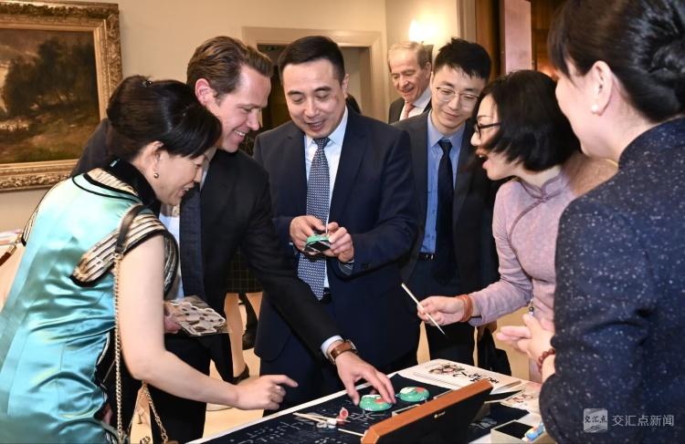 非遗展区集结苏州刺绣、扬州雕版印刷、常州孟河医派、扬州剪纸、惠山泥人、宜兴紫砂等技艺精彩亮相,与观众互动。传承人现场飞针劈线、演示针灸推拿,让观众亲身感受“一根丝线劈300份”的精微匠心与中医智慧。在雕版印刷展示台前,伊夫·莱特姆前首相和扬·布里尔斯主席满怀热情参与互动,他们认真地刷墨、覆纸、轻刷,手持拓印好的“和合如意”作品,笑着合影打卡。