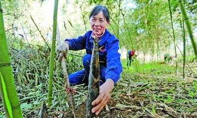竹林中,在余志菊的竹篓底部,除了鲜笋还躺着几瓶竹果昔——这是她在加工厂上班的“福利”。每天清晨,她先到自家3亩竹林采笋,顺路送到公司过秤,下午便换上工作服分拣饮品瓶。“每月工资3500元,卖笋一年收入七八千元,家门口就能挣钱,还能照顾老人孩子。”像她这样的村民,村里有20多人,加工厂里60%的岗位留给了雷竹种植户。