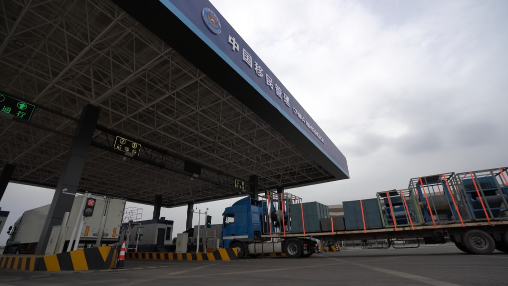 在霍尔果斯公路口岸,货车、商品车、工程车等排成长龙,从中国驶向哈萨克斯坦。