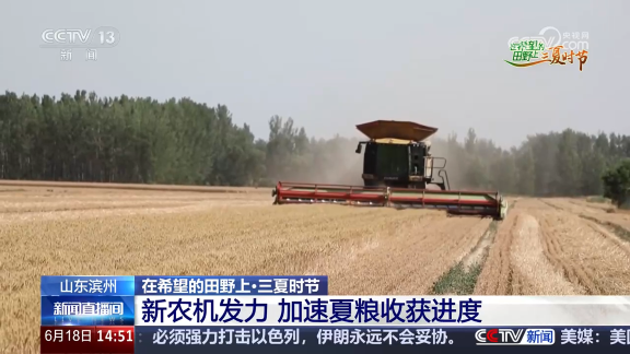 央视网消息:目前,山东小麦收获逐渐进入收尾阶段。在滨州市惠民县,当地抢抓晴好天气,利用新农机、新装备加快收获进度。