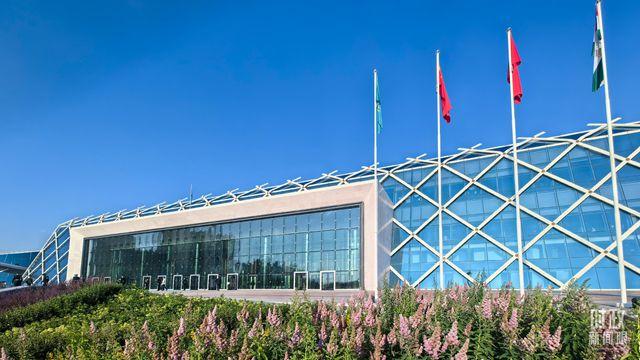 △会场外旗帜飘扬。(总台央视记者蒋硕拍摄)