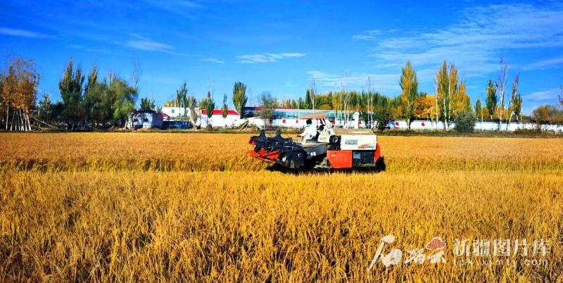 收割机在帕哈太克里乡肖尔巴格村田间收割水稻(2022年摄)。阿地力江·阿不都卡德尔摄