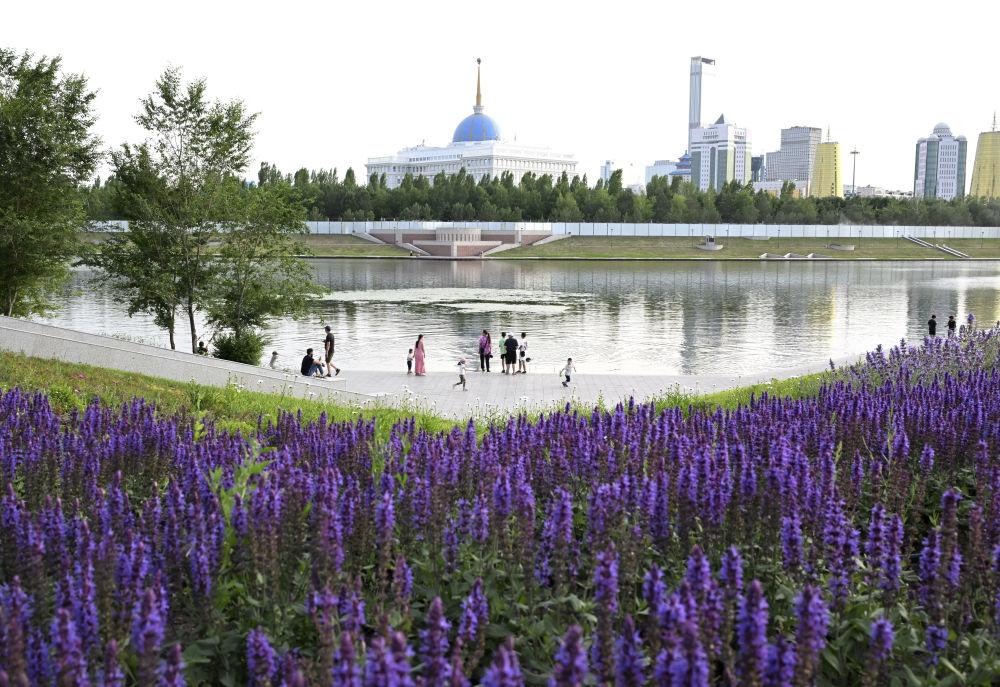 6月13日,人们在哈萨克斯坦首都阿斯塔纳的伊希姆河畔休闲。 新华社记者 燕雁 摄