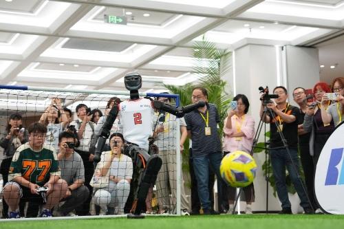 在北京市机器人产业园(亦庄)的“机器人大世界”前,“活力中国调研行”记者团最新观看了一场趣味足球赛,比赛双方是来自北京加速进化公司的人形机器人。正是这款机器人,让中国团队在今年3月的RoboCup机器人世界杯德国公开赛上夺得冠军。